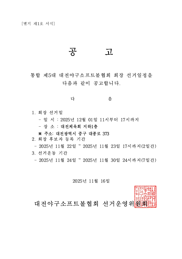 통합 제 5대 대전광역시야구소프트볼협회장선거 등록 공고